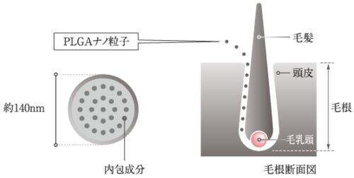 今回はナノインパクト100ホソカワミクロン100年磨いた技による最先端のナノ技術で140ナノミクロンつまり140メ-トルの10億分の1の大きさのカプセルに有効成分が詰まっています。そしてそのカプセルが1か月分60mlの中に100兆個!想像の域を越えていますね。 毛…